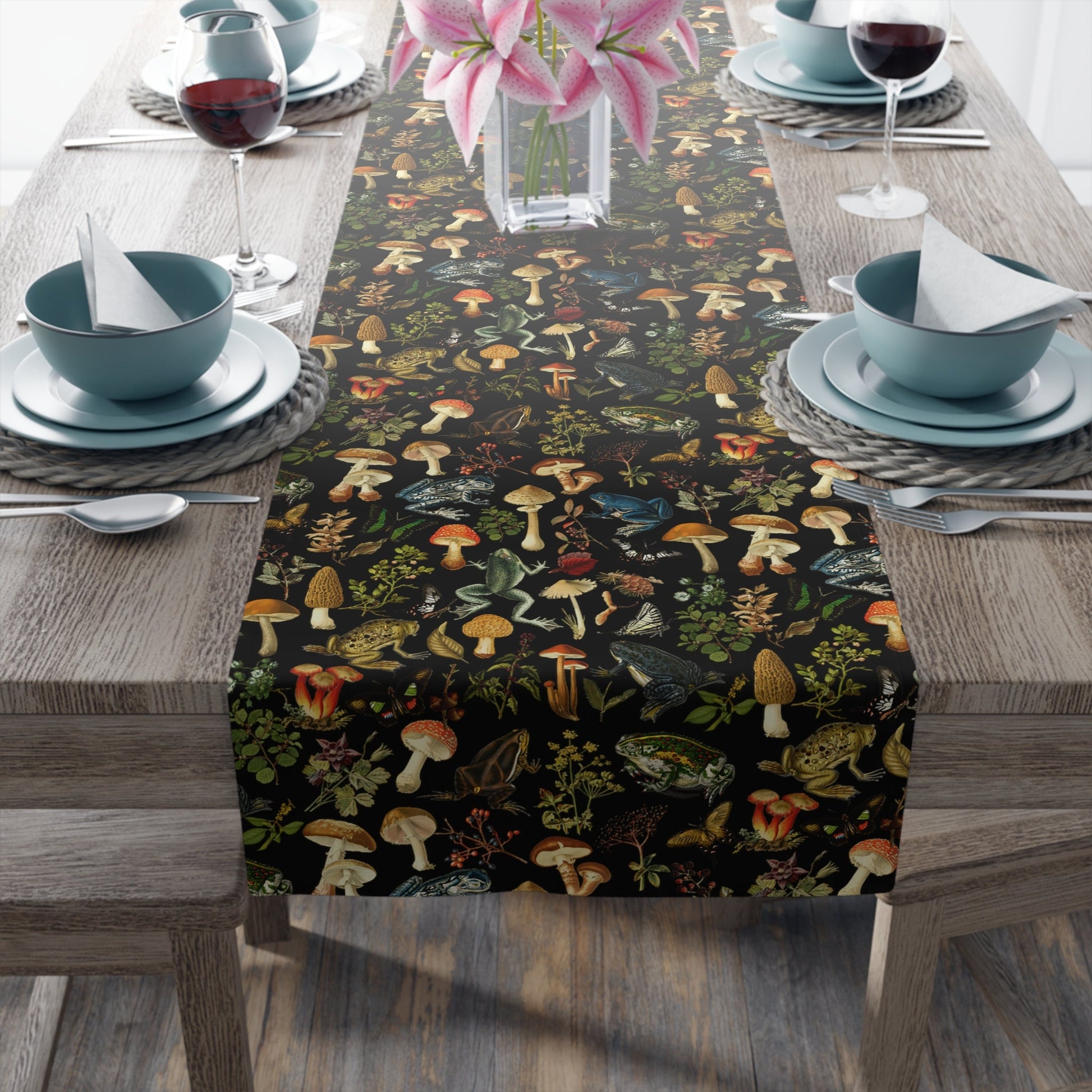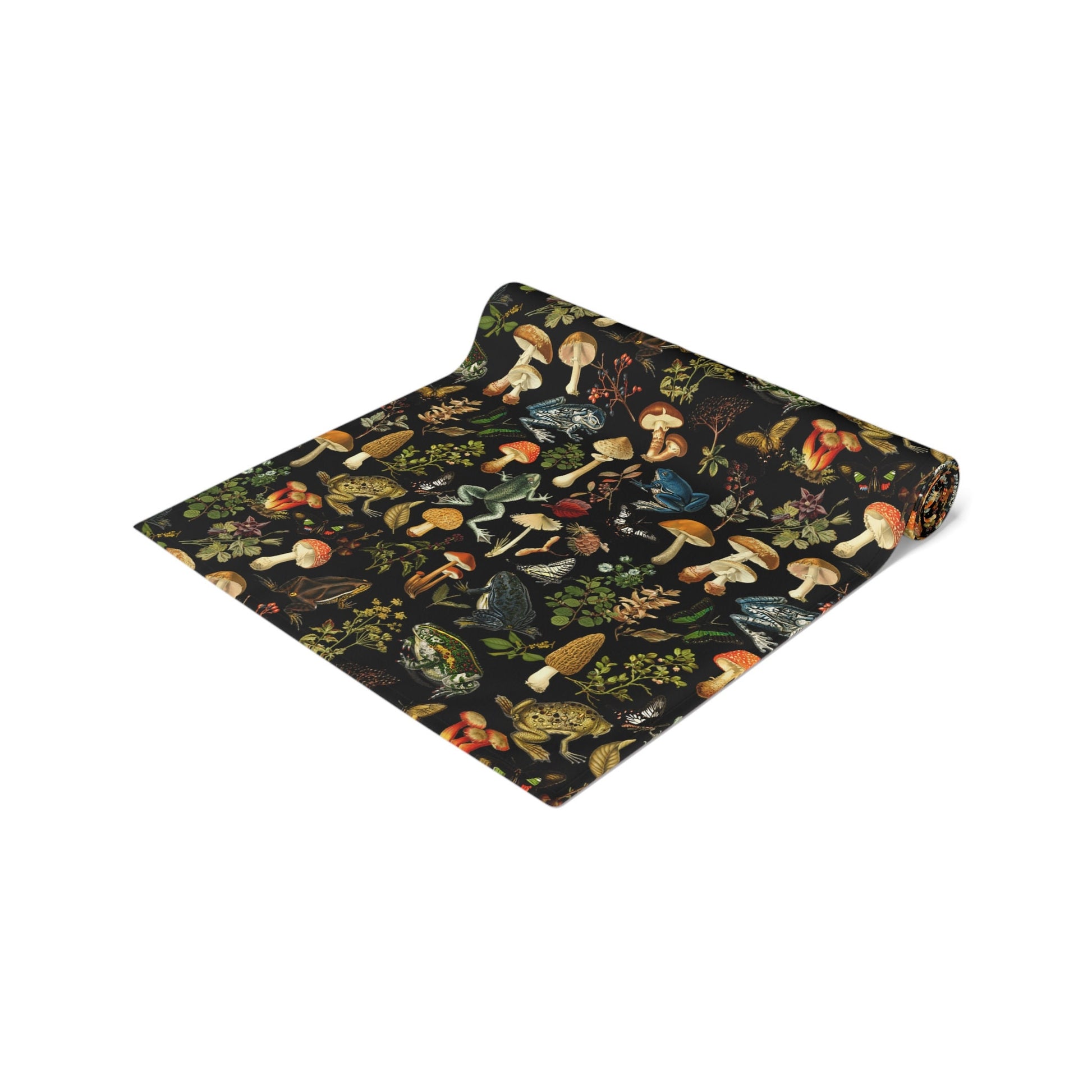 Instant Fall Cottagecore Decor with this black vintage mushroom, frogs and forest flowers table runner. Easy to store and can be used for any Farmhouse Halloween decor aesthetic too.
