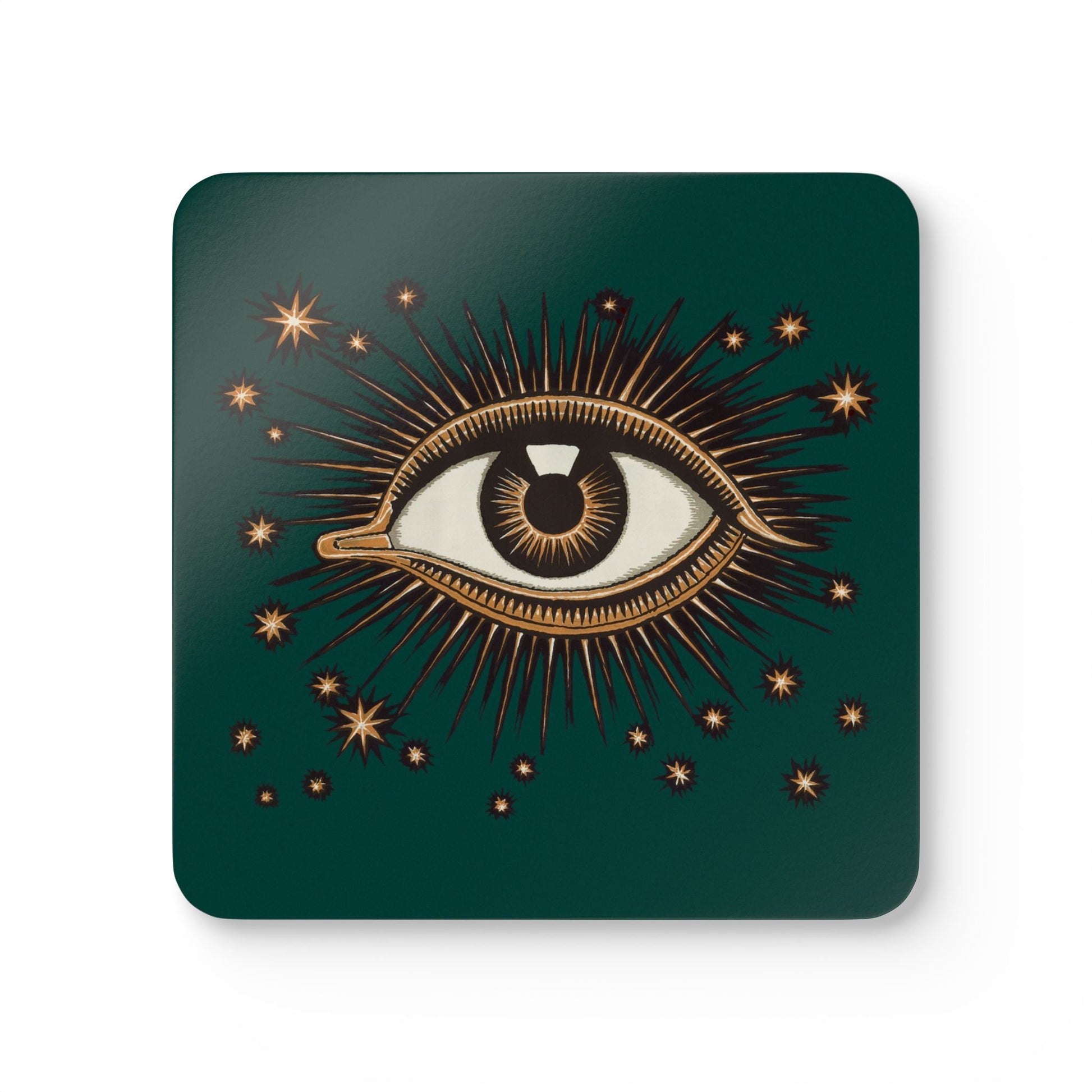 Set of 4 dark green Evil Eye cork backed coasters for protecting your surfaces in a fun way, perfect for halloween, or just for any witchy goth aesthetic room or space.