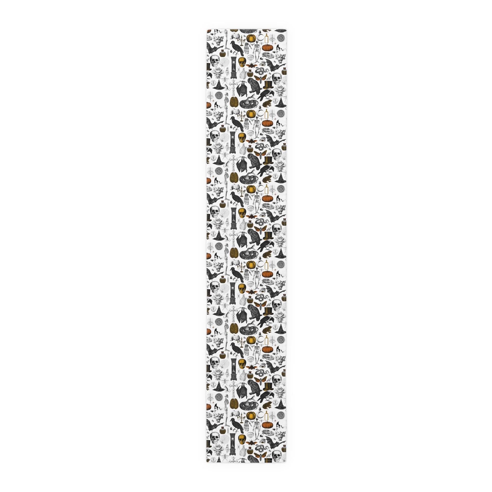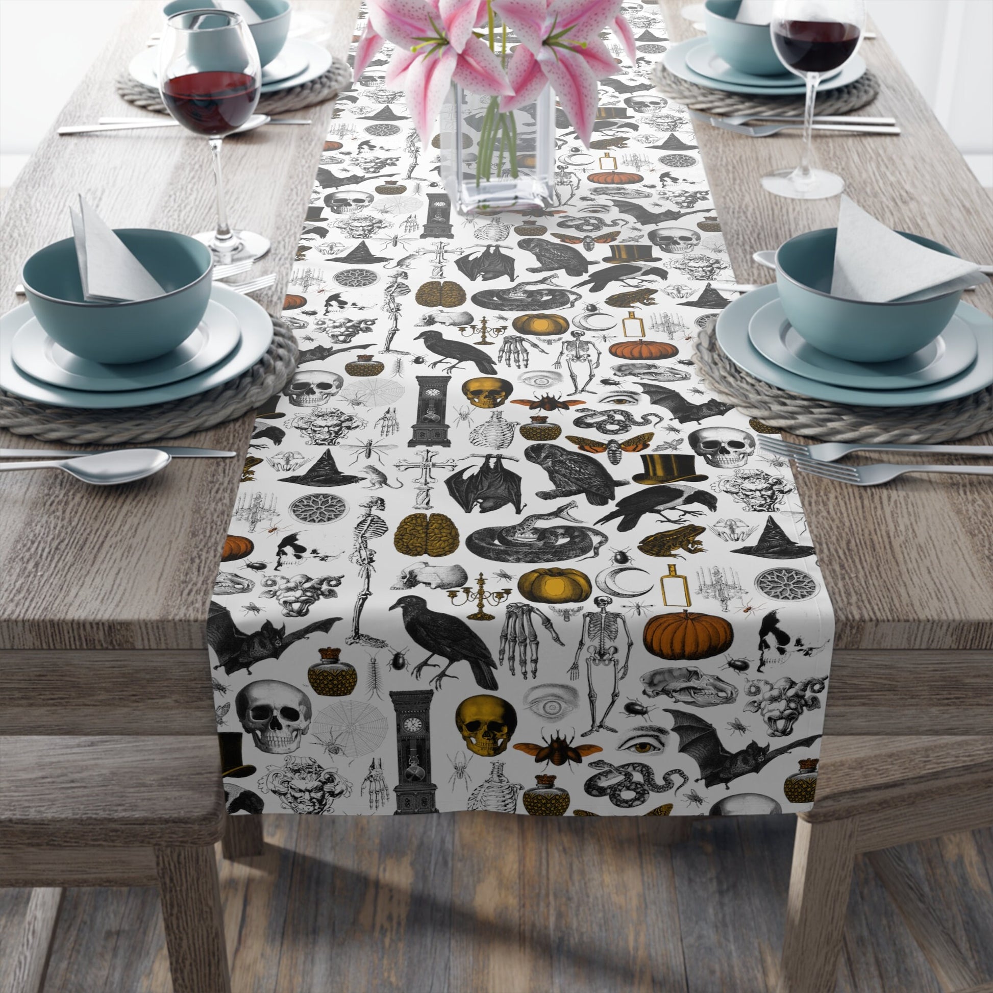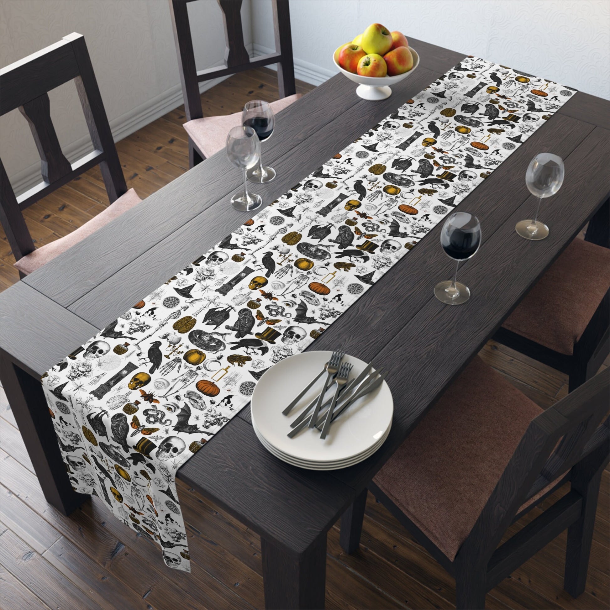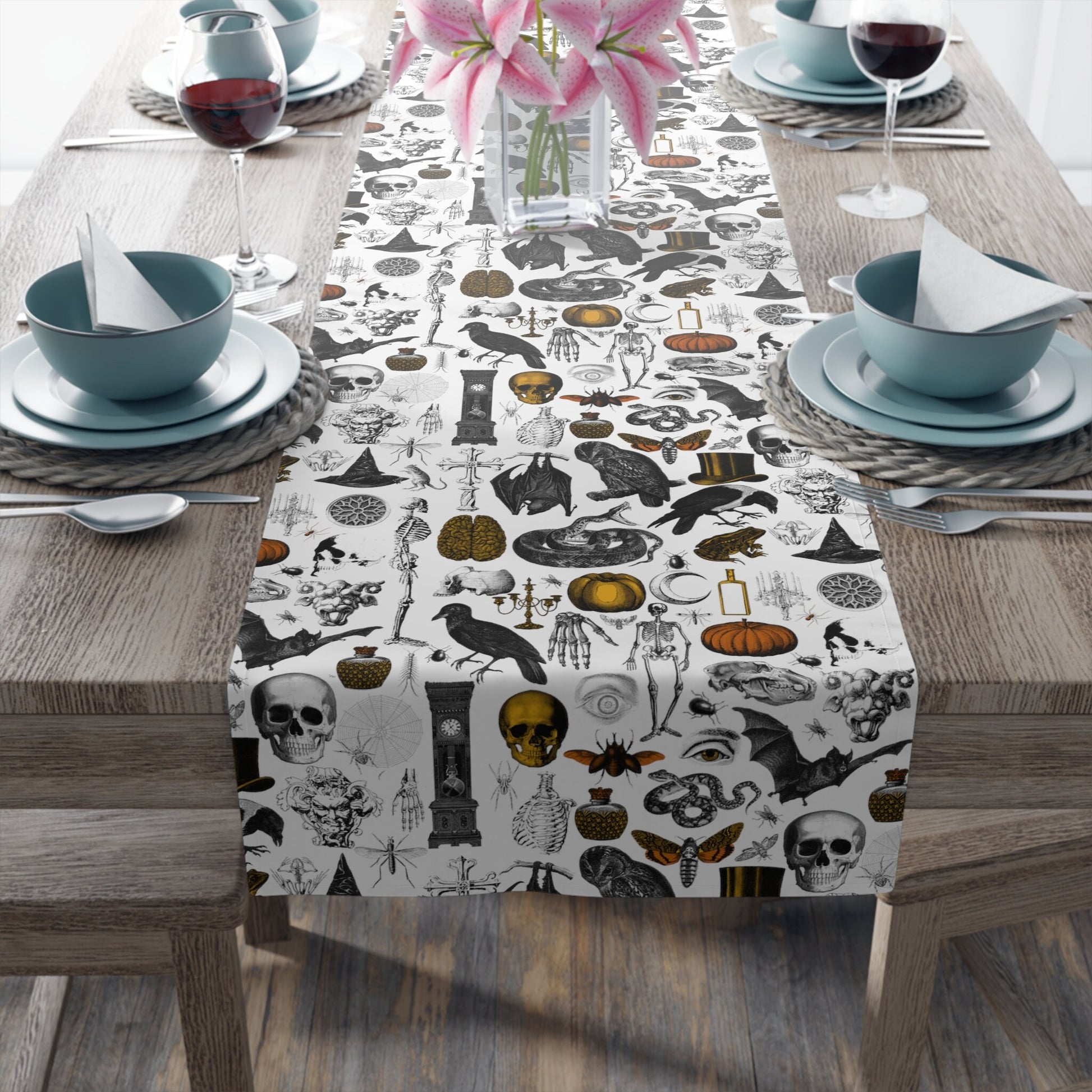 Instant dark academia decor with this white gothic table runner. The ideal Halloween table decoration.