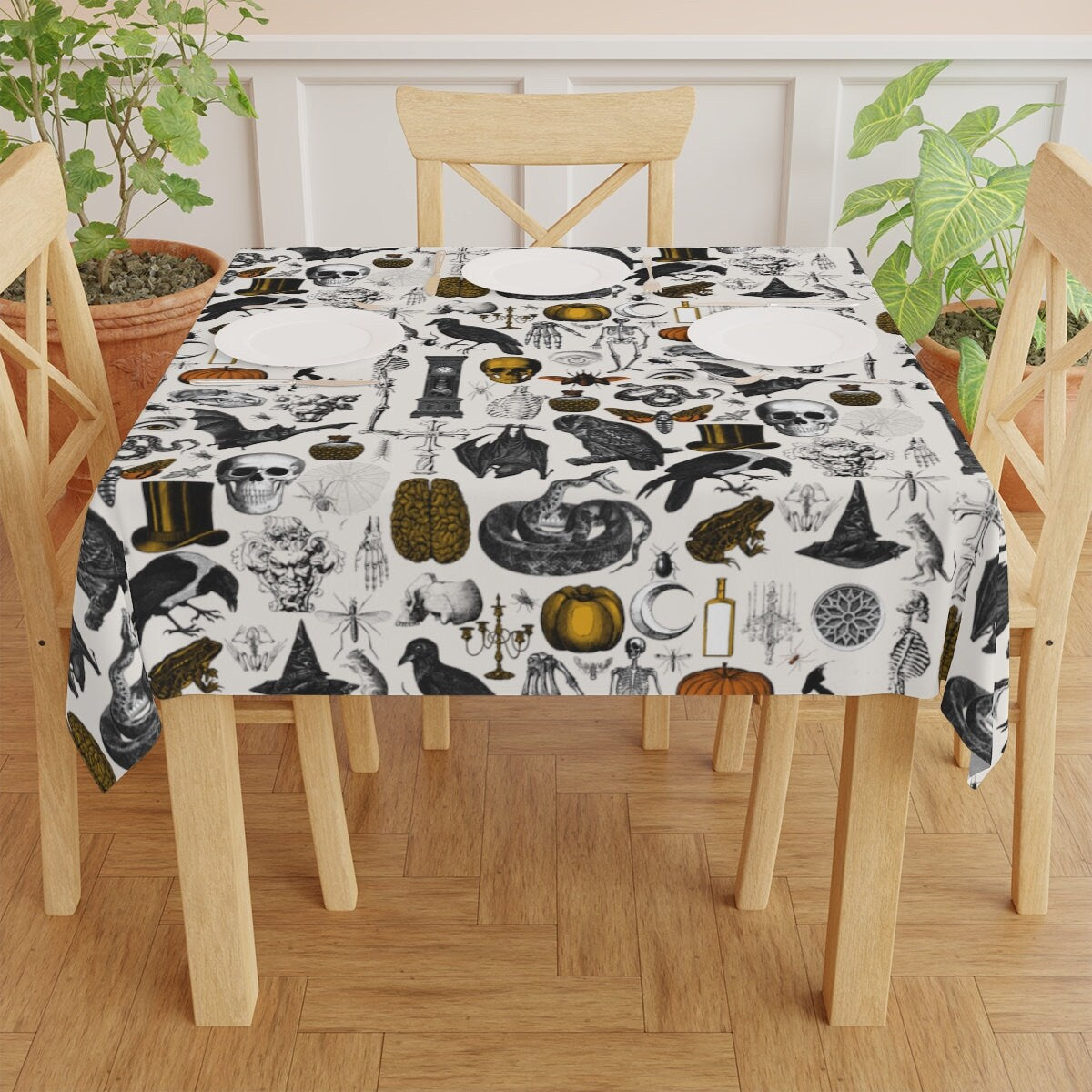 Off white vintage spooky illustrations tablecloth. Perfect to add a vintage gothic feel to any space featuring skulls, skeletons, bones, insects and frogs this is the ideal tablecloth for a spooky themed party or event.