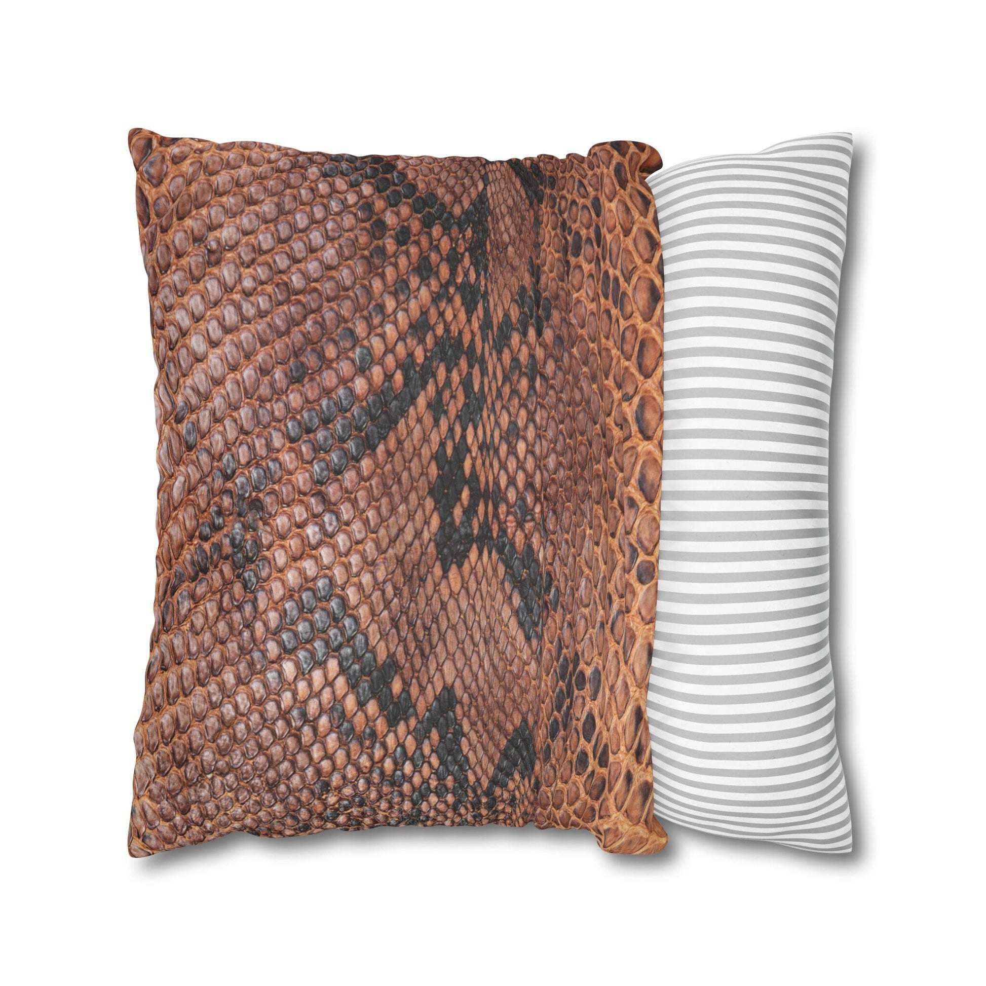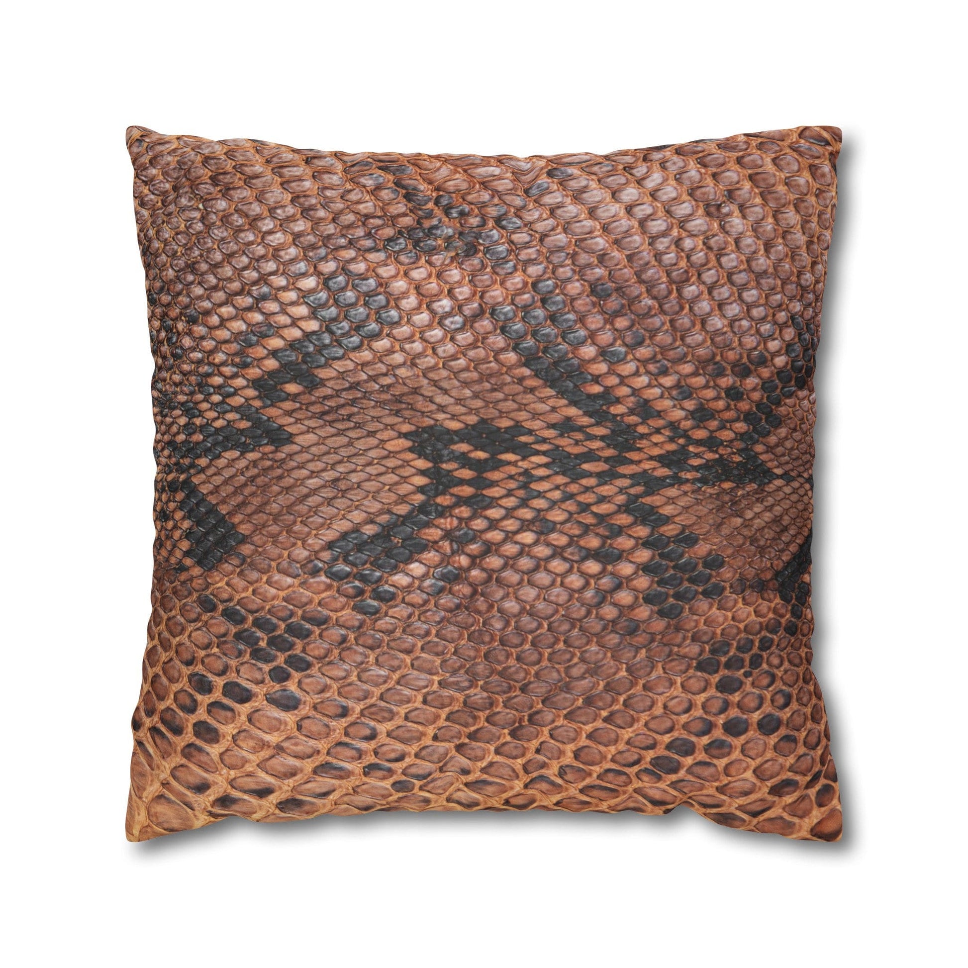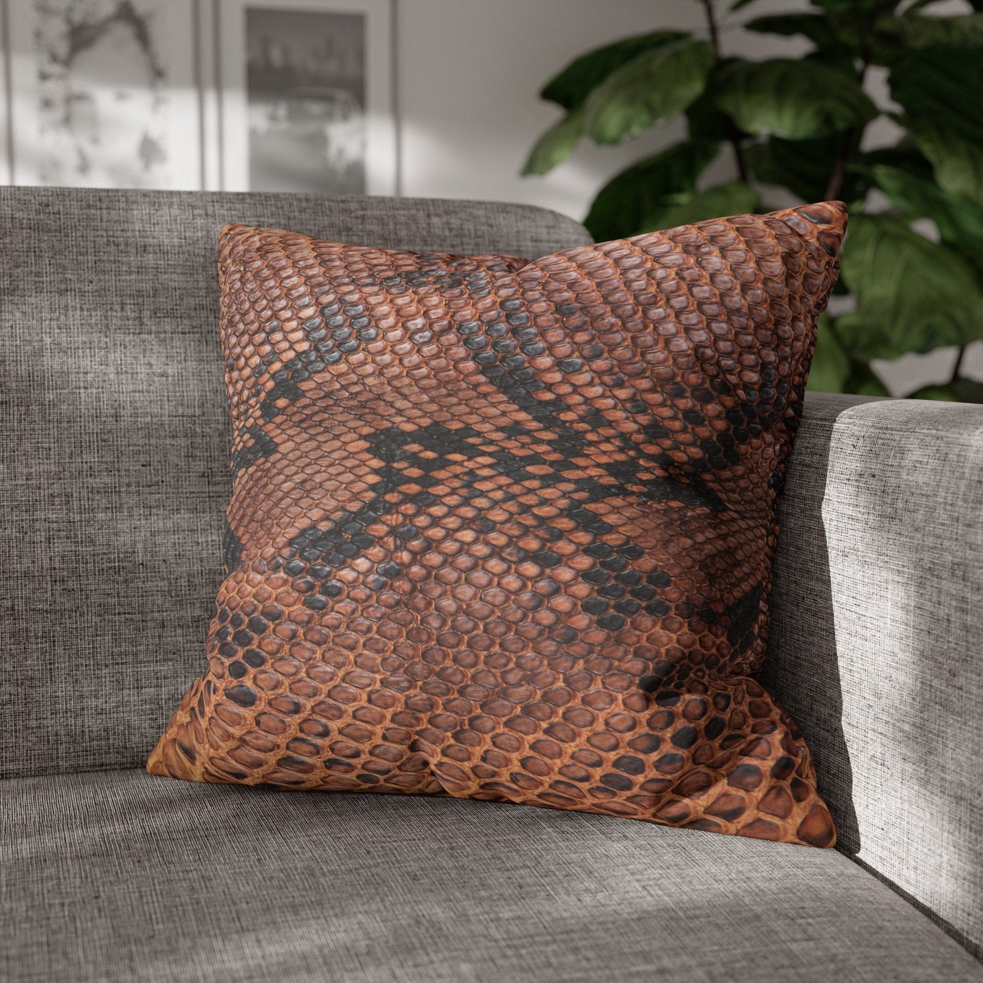Bring a touch of exotic flair to your living space with this luxurious faux suede pillow cover featuring a captivating snake skin print. The rich brown tones and textured pattern add a reptile touch to any couch, armchair, or bed.