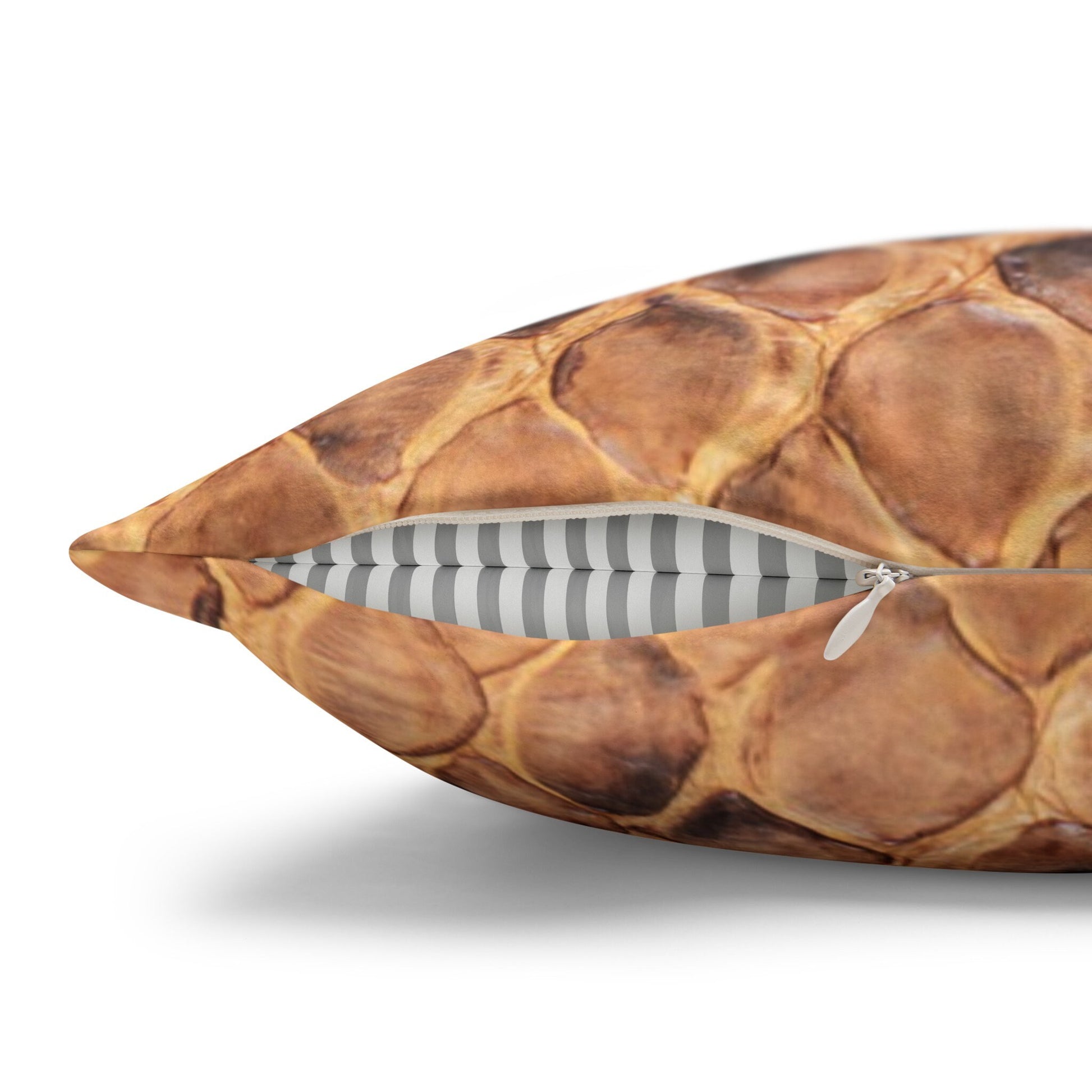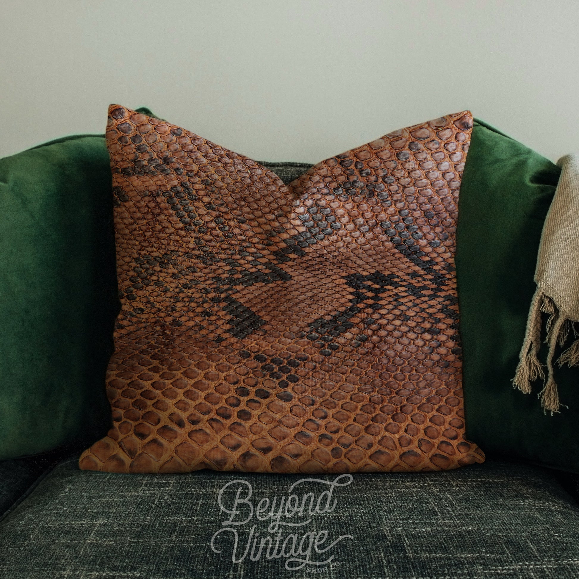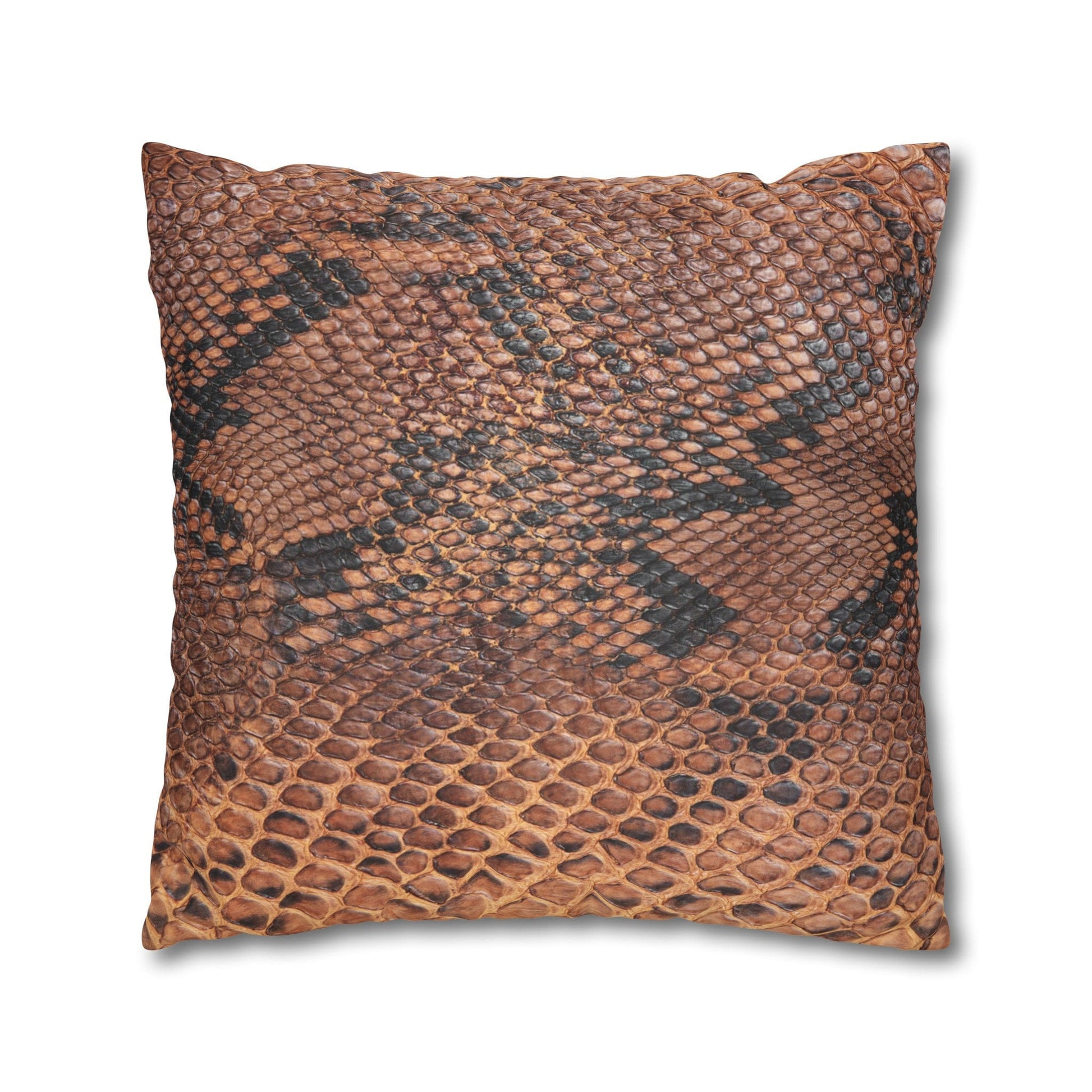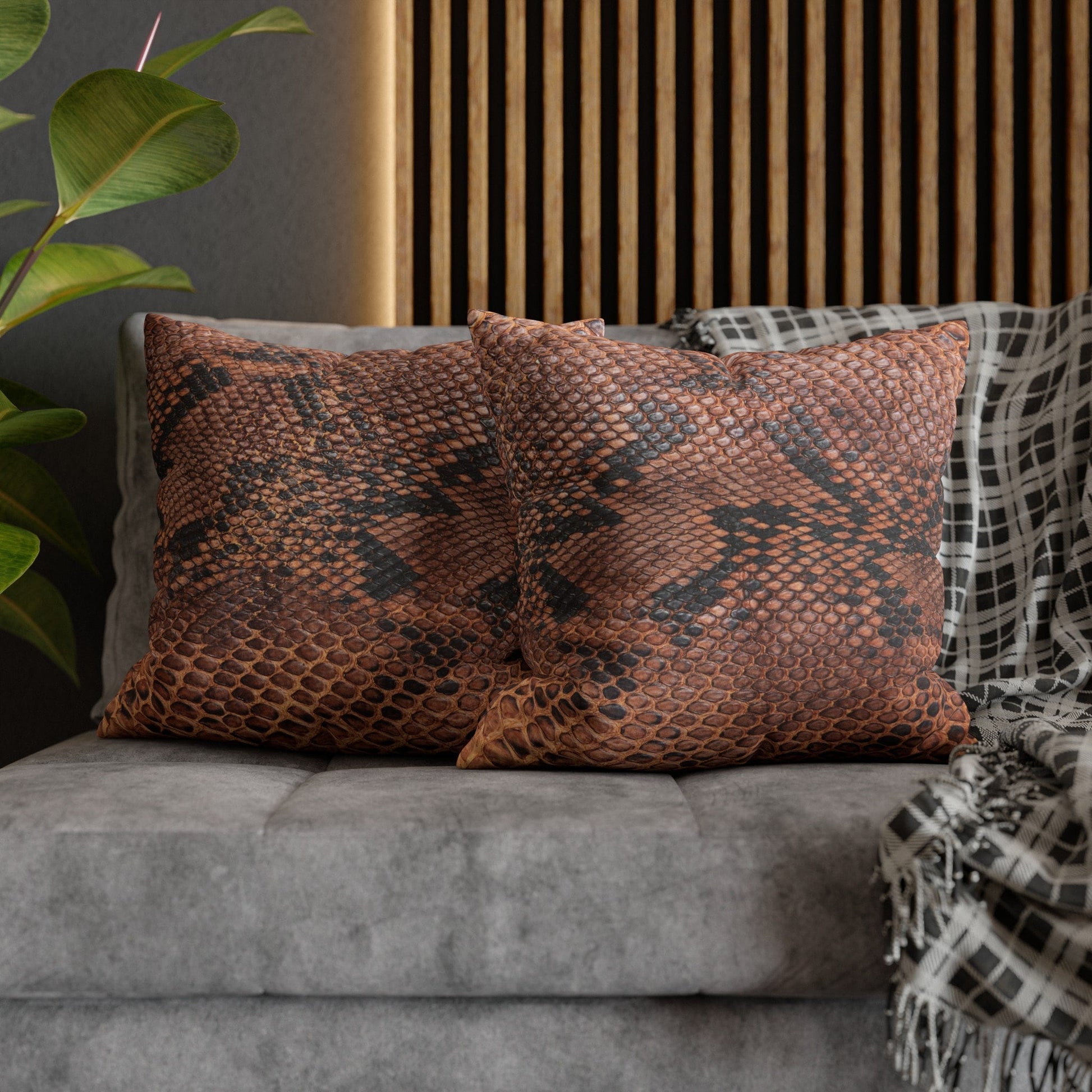 Bring a touch of exotic flair to your living space with this luxurious faux suede pillow cover featuring a captivating snake skin print. The rich brown tones and textured pattern add a reptile touch to any couch, armchair, or bed.